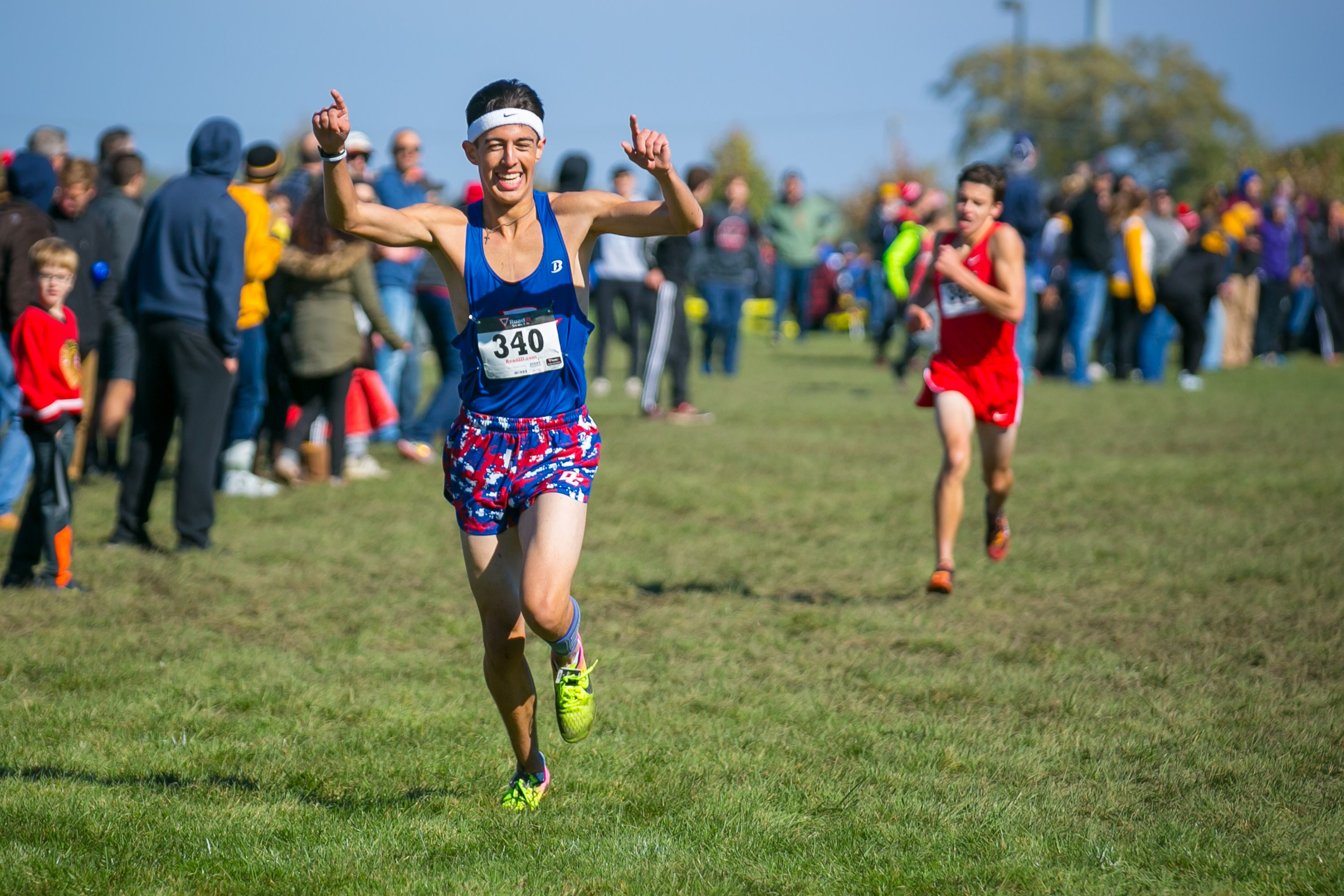 Dundee-Crown senior Adam Swanson celebrates just before finishing the boys race during the Fox Valley Conference Cross Country Meet at Hampshire High School, Hampshire, Ill., Oct. 13, 2018. Swanson finished in first place with a time of 15:41.9. (Daryl Quitalig/Shaw Media)