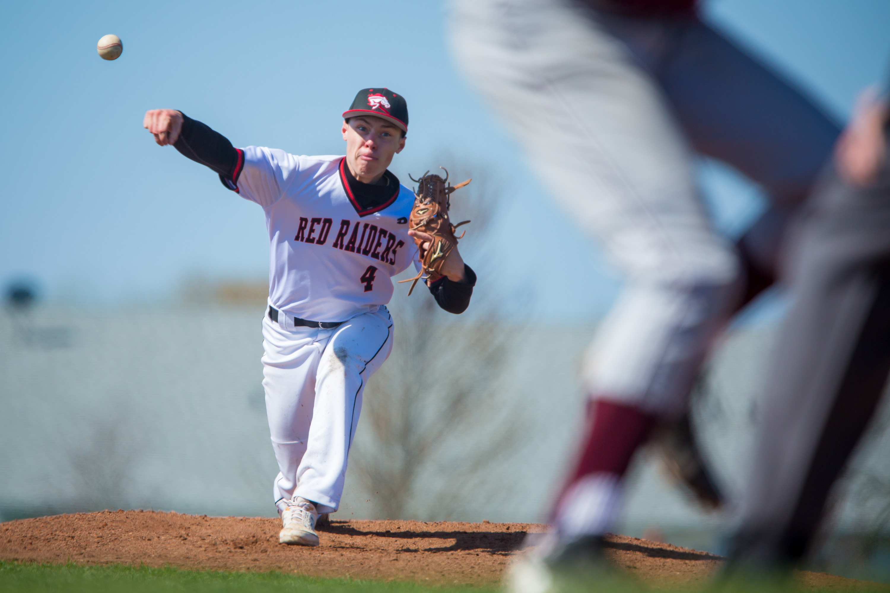 Huntley pitcher Eli Paplanus (4) delivers a pitch in the second inning of the Fox Valley Conference game at Huntley High School, Huntley, Ill., Saturday, May 4, 2019. The Red Raiders won, 3-1. (Daryl Quitalig/Shaw Media) Previous Image Next Image